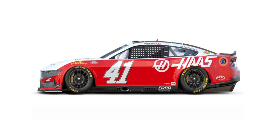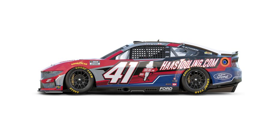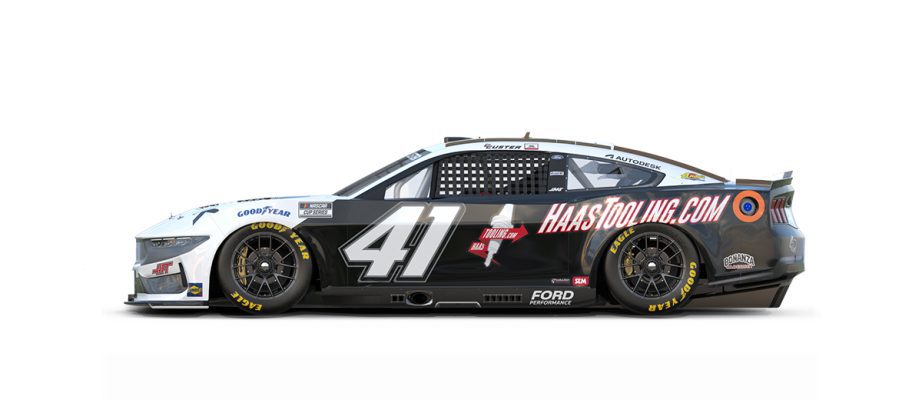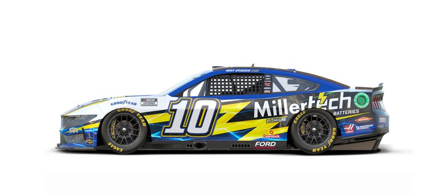 Noah Gragson #4 MillerTech Ford Mustang–New scheme for 2025, white, black, blue and yellow with lightning motif. C