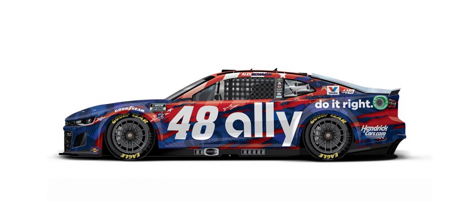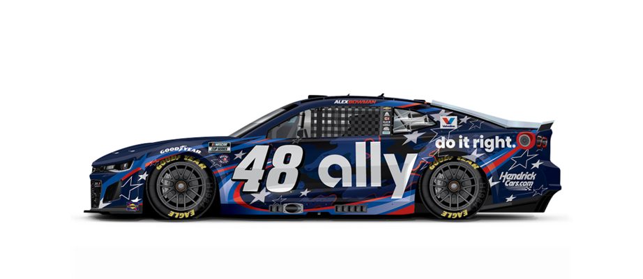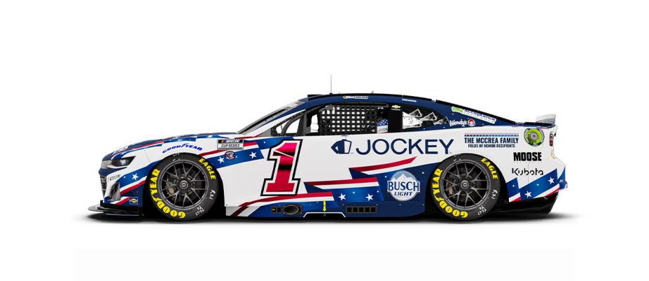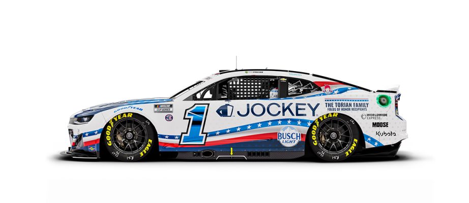 Ross Chastain #1 Jockey x Folds of Honor Chevy Camaro–New scheme for 2025, white with cutting edge patriotic stripes. C