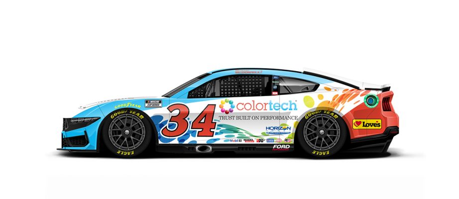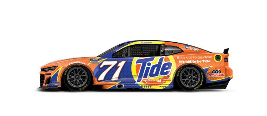 Michael McDowell #71 Tide Chevy Camaro-New sponsor for 2025, blue, orange, and yellow with designs. F