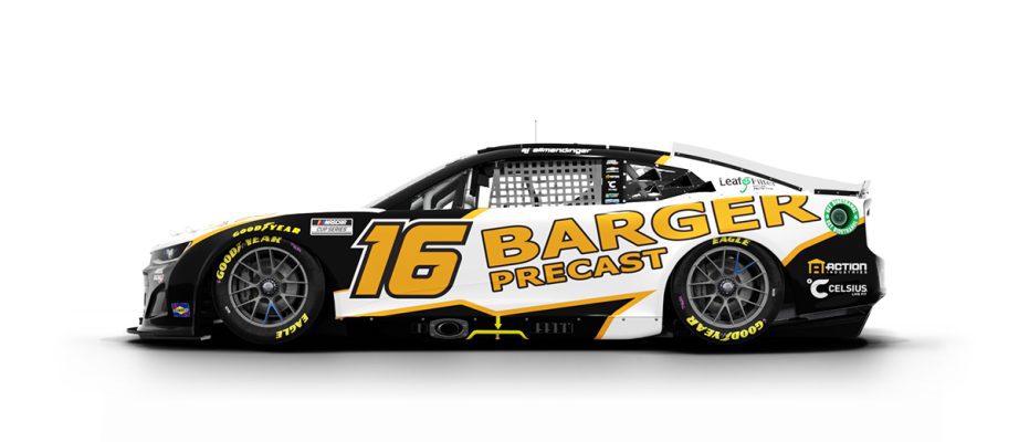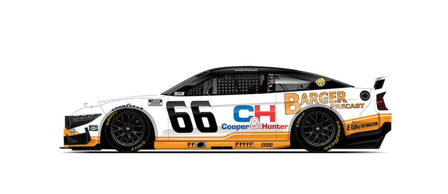 Chad Finchum #66 Barger Precast Ford Mustang–New sponsor for 2025, white with green stripe and black roof. A