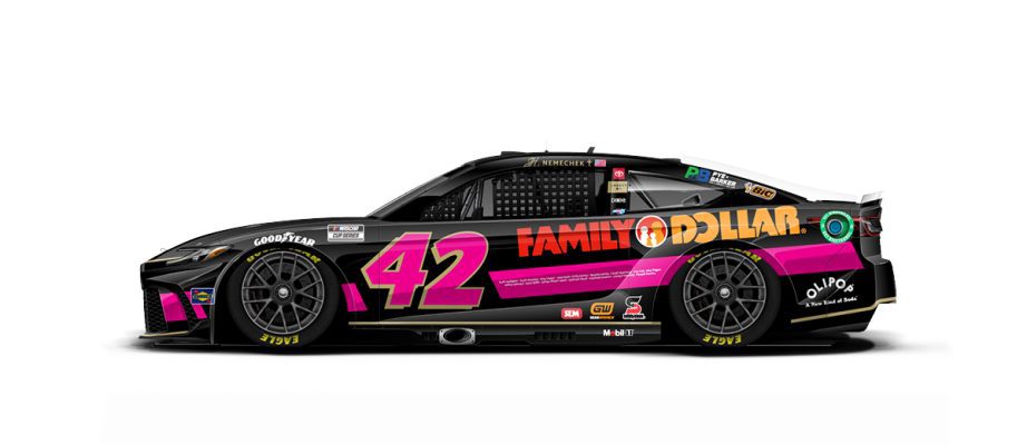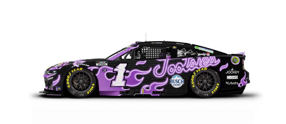 Ross Chastain #1 Tootsies Orchid Lounge Chevy Camaro–New scheme for 2025, black with purple neon flames. A