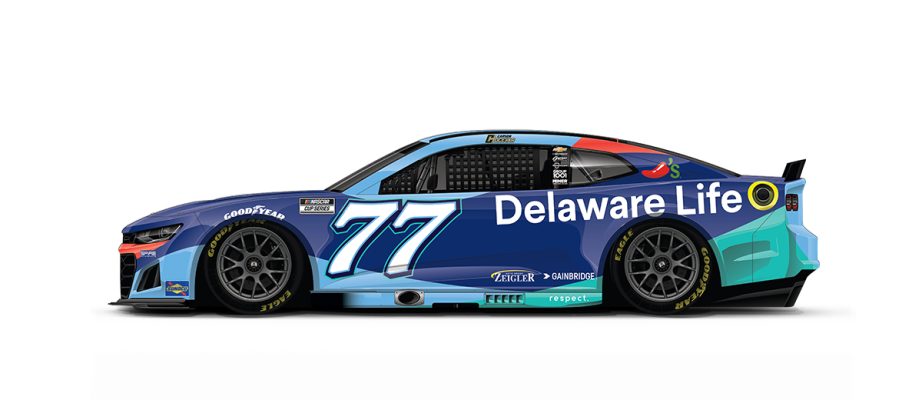 Carson Hocevar #77 Delaware Life Chevy Camaro–New scheme for 2025, some slight changes and a red stripe added. C-