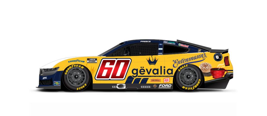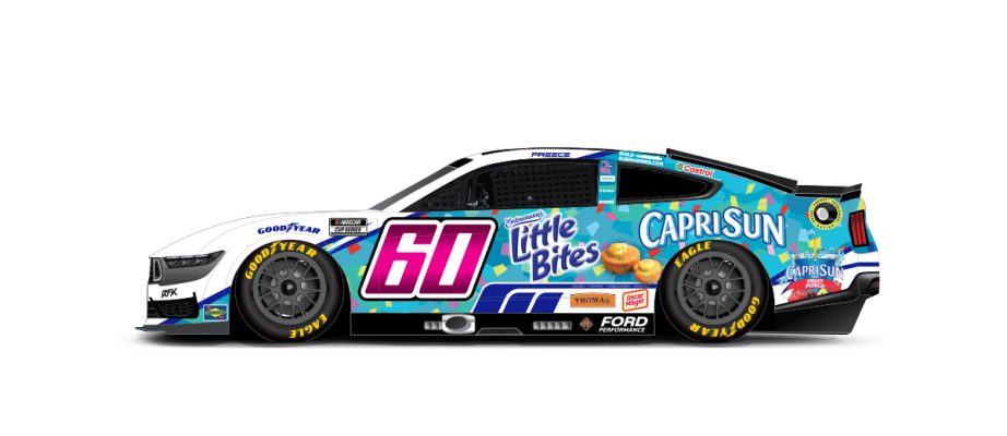 Ryan Preece #60 Kroger/Entenmann’s Little Bites/Capri Sun Ford Mustang-New sponsors for 2025, white and blue with confetti. F
