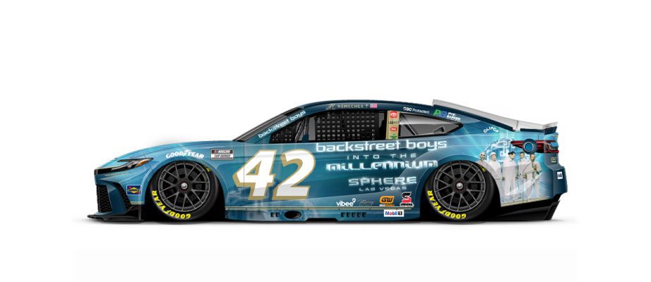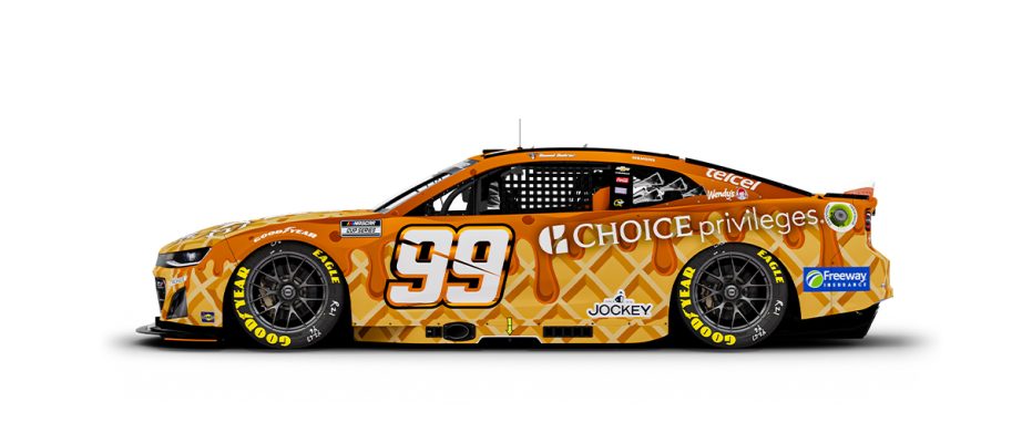 Daniel Suárez #99 Choice Privileges Chevy Camaro-New scheme for 2025, waffle with syrup motif. A