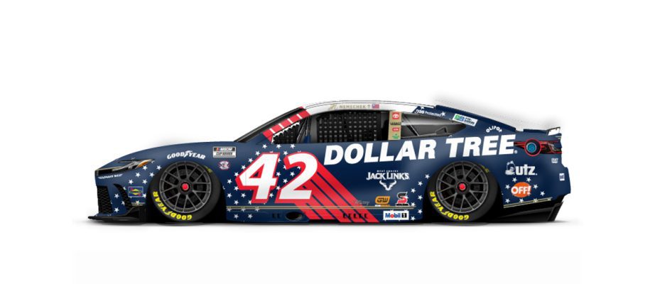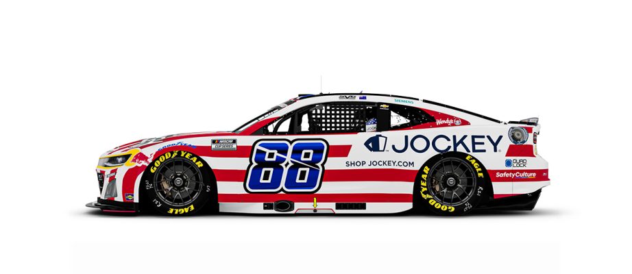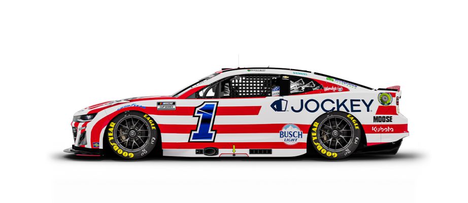 Ross Chastain #1 Jockey Chevy Camaro–New scheme for 2025, back to the patriotic stripes. A