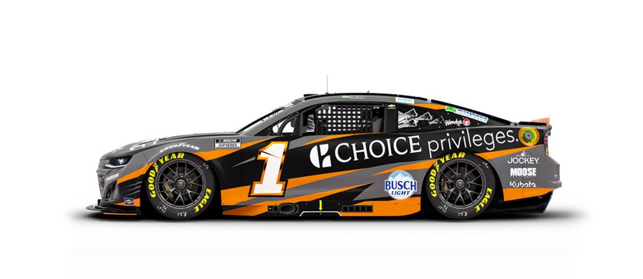 Ross Chastain #1 Choice Privileges Chevy Camaro–New scheme for 2025, design changes, more black and gray added. F
