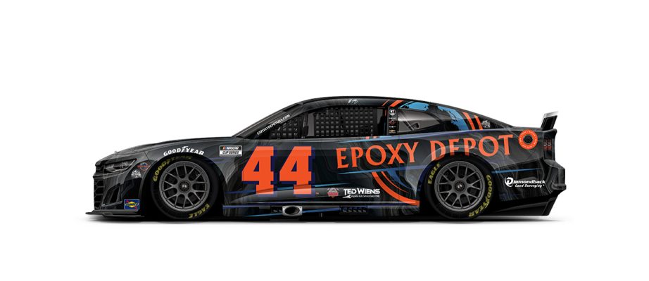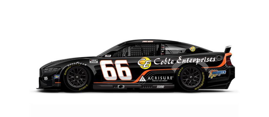 Casey Mears #66 Coble Enterprises Ford Mustang–New scheme for 2025, black with orange and white stripes. A