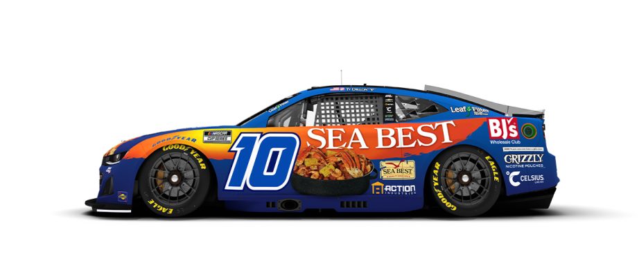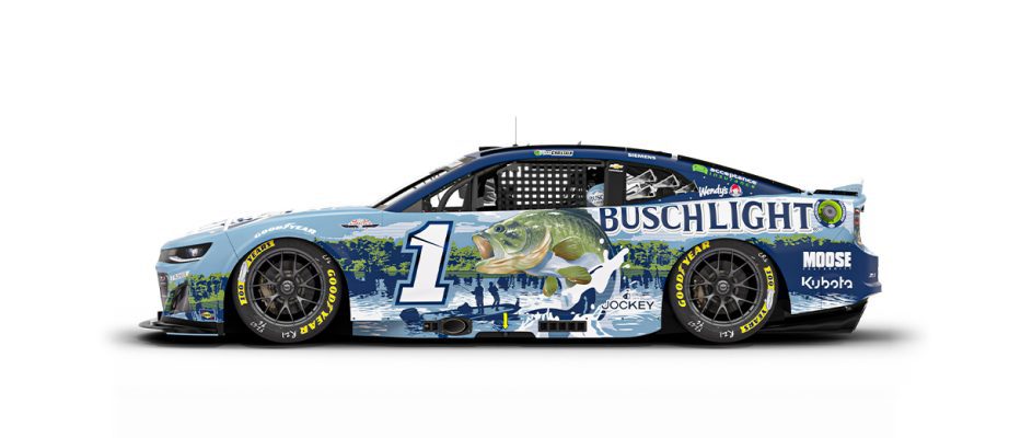 Ross Chastain #1 Busch Light Fishing Chevy Camaro-New scheme for 2025, blue with fishing motif across whole car. A