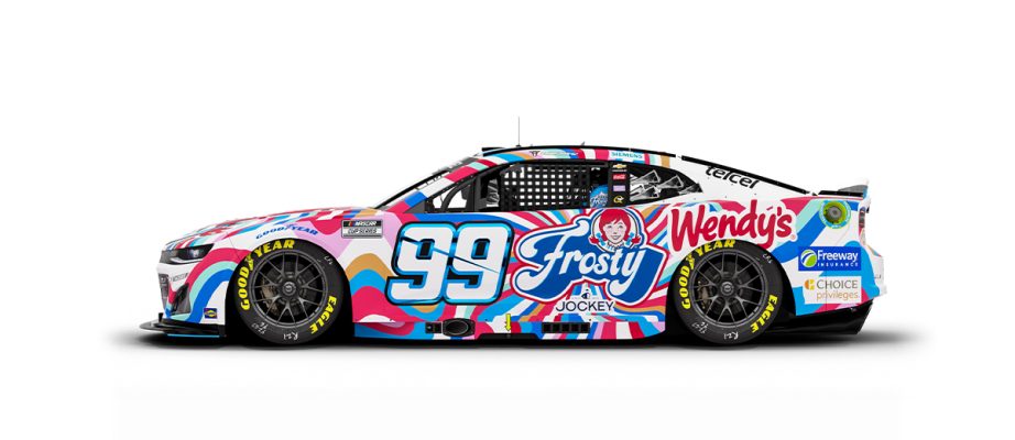 Daniel Suarez #99 Wendy’s Frosty Chevy Camaro-New sponsor for 2025, white with multi-colored stripes across car. F