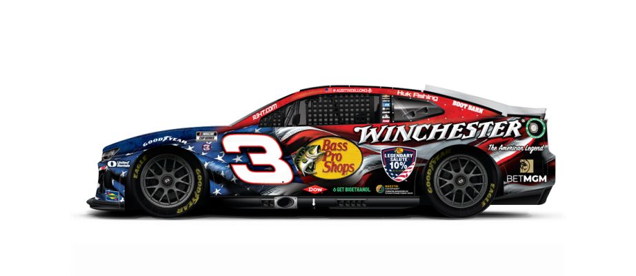 Austin Dillon #3 Bass Pro Shops/Winchester Patriotic Chevy Camaro-New scheme for 2025, patriotic elements replace camo. C
