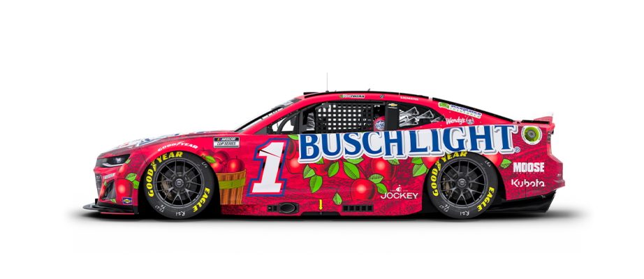 Ross Chastain #1 Busch Light Apple Chevy Camaro-New scheme for 2025, red with apple motif. A