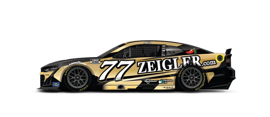 Carson Hocevar #77 Zeigler Auto Group 50th Anniversary Chevy Camaro-New scheme for 2025, gold designs replace yellow and white. C