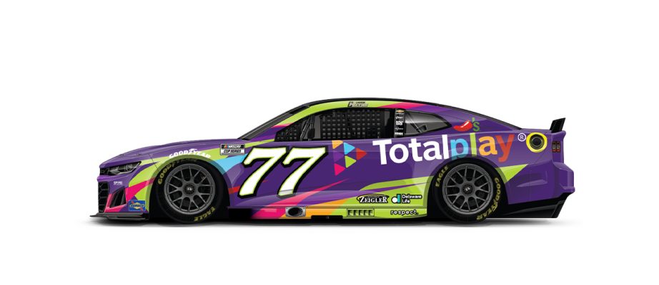 Carson Hocevar #77 Totalplay Chevy Camaro-New sponsor for 2025, dark blue with yellow, pink, light blue and red designs. F