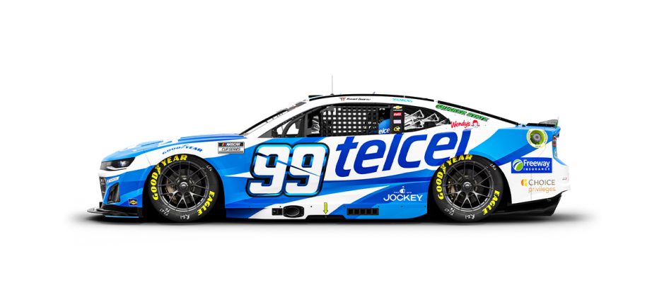 Daniel Suarez #99 Telcel Chevy Camaro-New sponsor for 2025, white with dark and light blue stripes. B