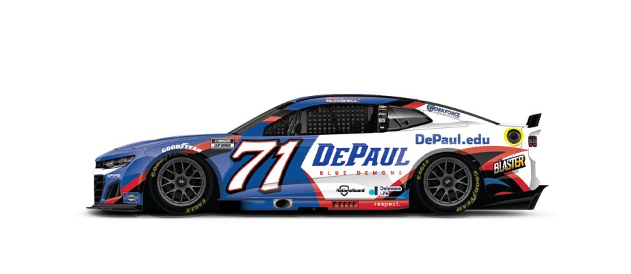 Michael McDowell #71 DePaul Chevy Camaro-New sponsor for 2025, red, white, and blue with Blue Demon motif. C