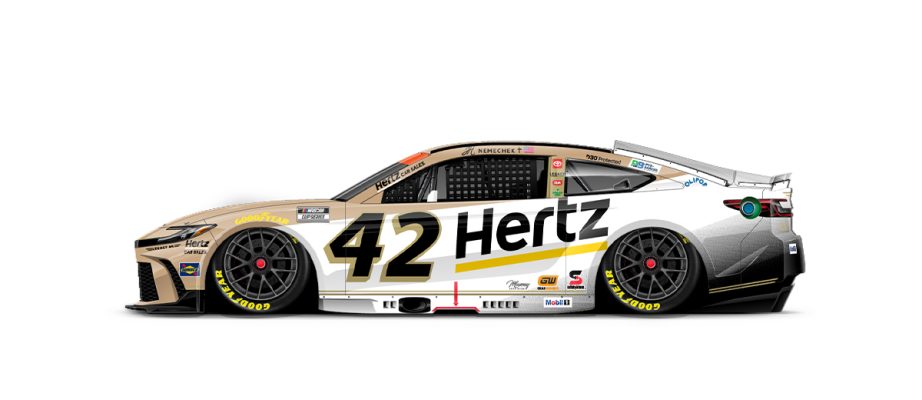 Ross Chastain #1 Trackhouse Chevy Camaro-New scheme for 2025, gray and yellow with a series of designs. F