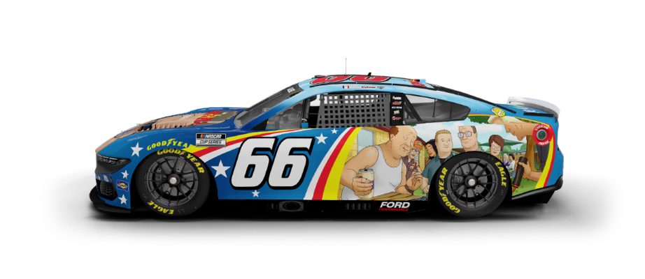 Joey Gase #66 King of the Hill on Hulu Ford Mustang-New sponsor for 2025, red, yellow, white and blue with King of the Hill motif. A