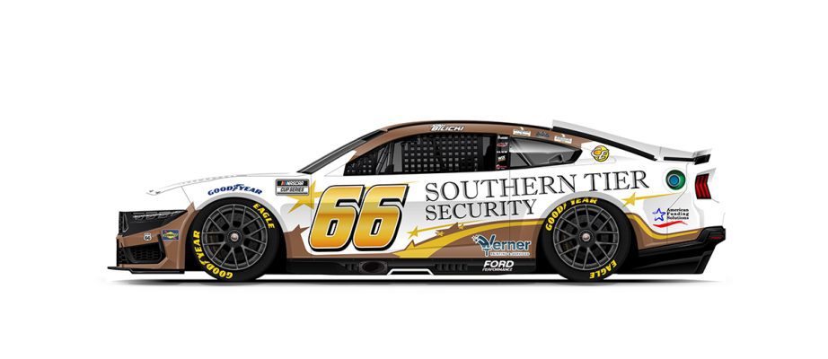 Josh Bilicki #66 Southern Tier Security Ford Mustang-New sponsor for 2025, white green, and yellow with stripes and stars. C