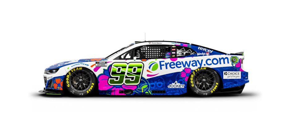 Daniel Suarez #99 Freeway Insurance Chevy Camaro–New scheme for 2025, blue with green and white. A