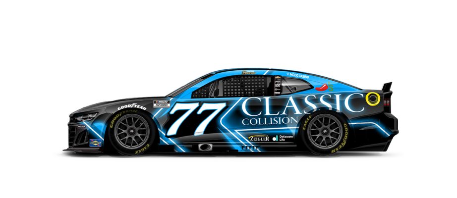 Carson Hocevar #77 Classic Collision Chevy Camaro-New sponsor for 2025, black with neon blue stripes. C