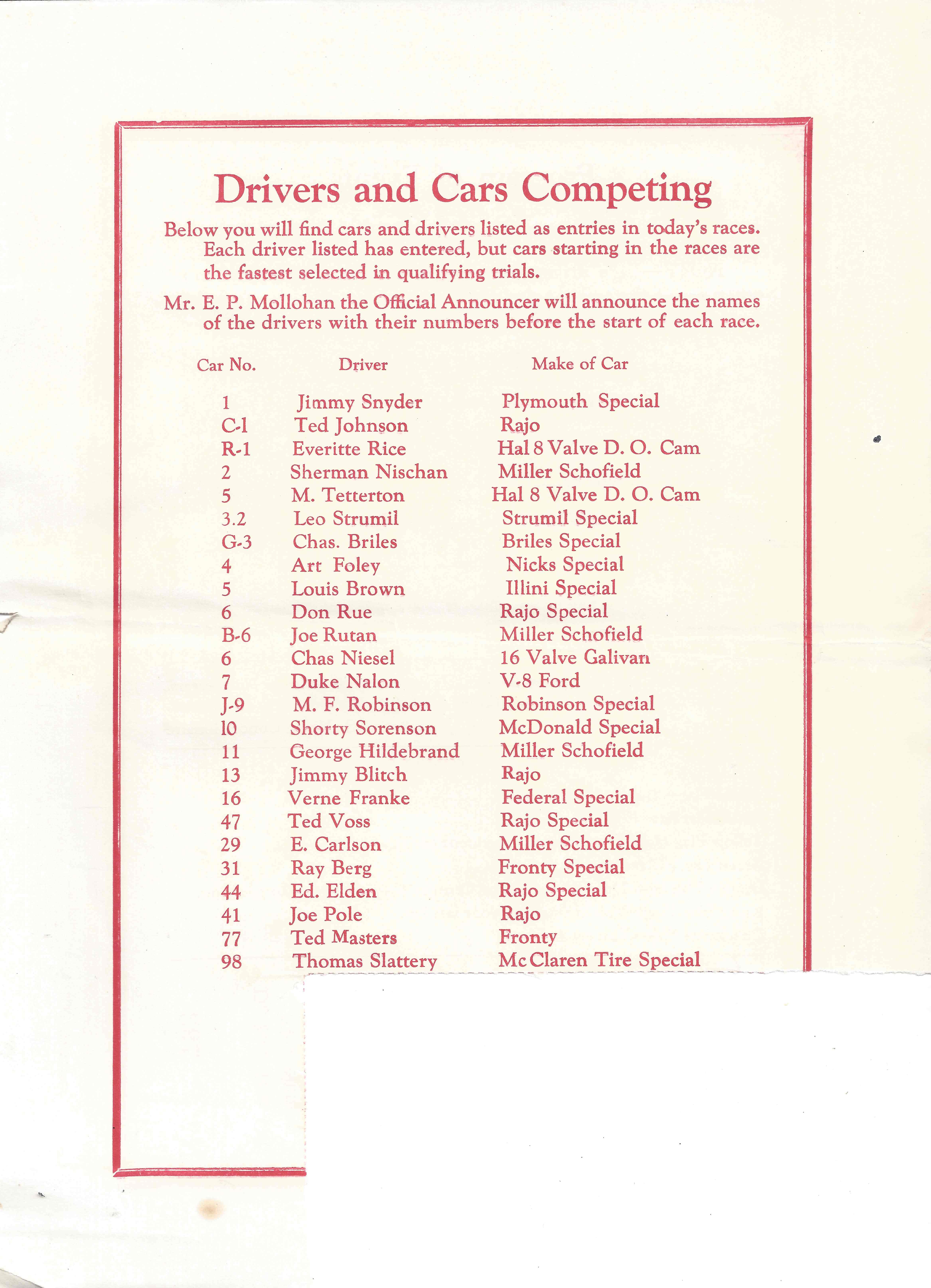 -According to a 1932 program, the track was known as Tessville Motor Speedway. This same program shows Len Barnard as President and Charles Barnard as Vice President, Miles E. Barry – Announcer, John Ugaste – Starter and Norman Ross – Publicity Director