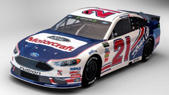 Ricky Stenhouse Jr. #17 Ford EcoBoost Ford Fusion–New scheme for 2017, red top, blue and white striped side. D-