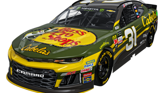 Austin Dillon #3 Realtree Chevy Camaro–New scheme for 2018, yellow and blue tye dye on hood, Realtree camouflage on sides, yellow and black curves separating the two. F
