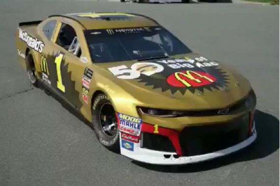 Jamie McMurray #1 McDonald’s Big Mac 50th Anniversary Throwback Chevy Camaro-New scheme for 2018, all gold with red gear logos on sides and hood. A