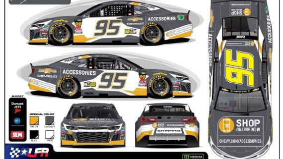 Kasey Kahne #95 Chevy Accessories Chevy Camaro-New sponsor for 2018, gray with white and gold designs on sides. F