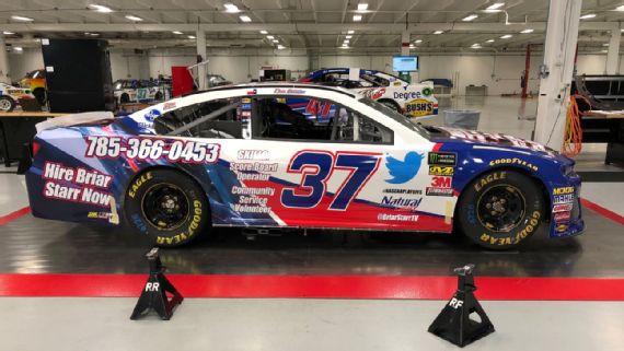 Garrett Smithley #99 Victory Lane Oil Change Chevy Camaro-New sponsor for 2018, red and white with checkered flag motif on sides. A
