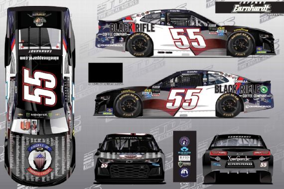 Jeffery Earnhardt #55 Black Rifle Coffee Chevy Camaro-New sponsor for 2018, black with memorial on hood, and patriotic scheme on sides. A-