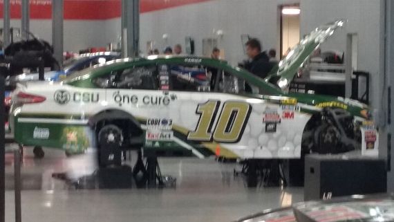 Garrett Smithley #99 Victory Lane Oil Change Chevy Camaro-New sponsor for 2018, red and white with checkered flag motif on sides. A