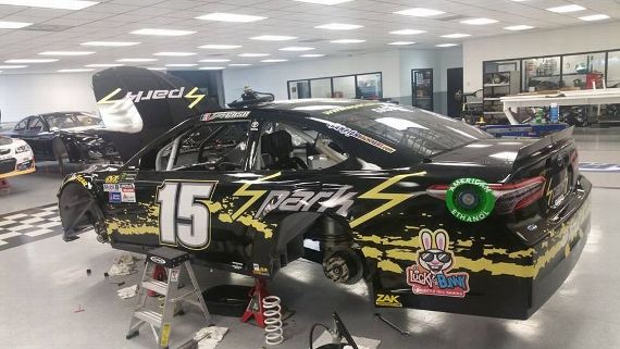 Garrett Smithley #99 Victory Lane Oil Change Chevy Camaro-New sponsor for 2018, red and white with checkered flag motif on sides. A