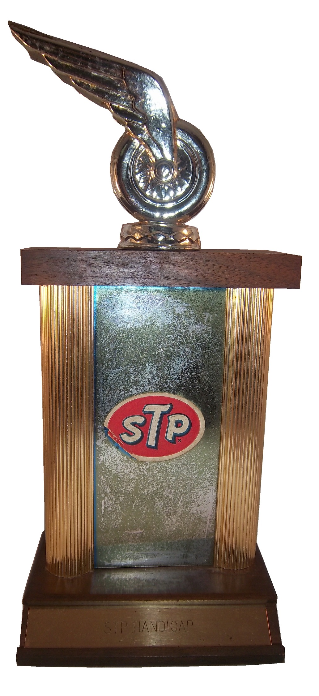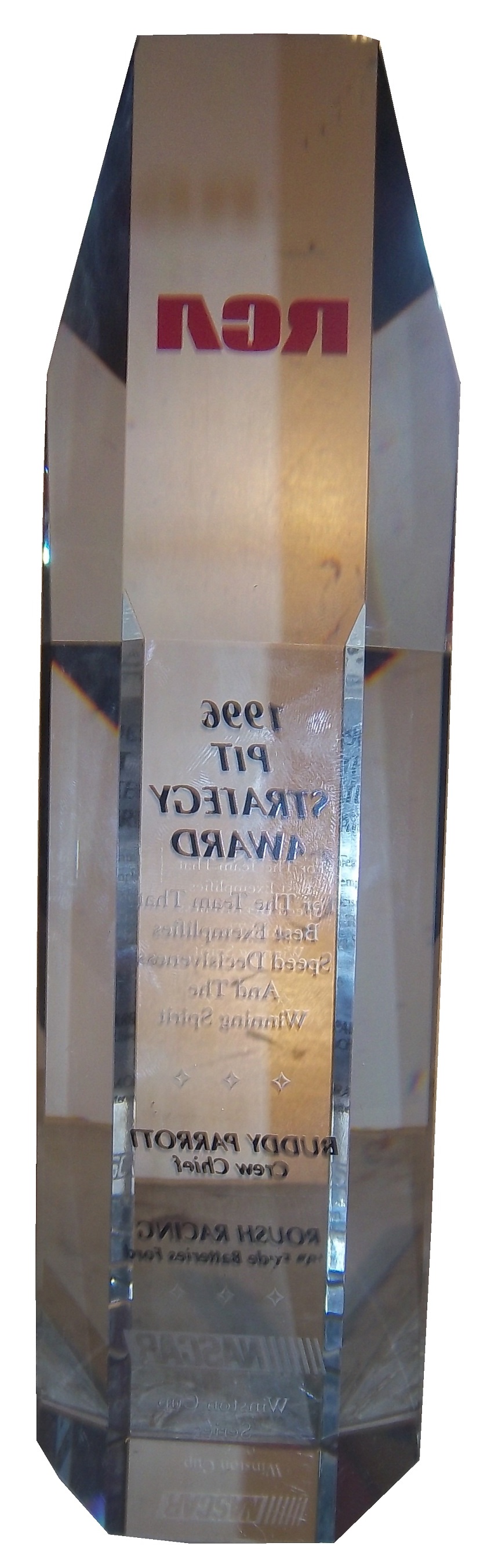 Then again, there is something to be said for the traditional trophy. One driver who had a lot of them is Ernie Derr. Derr raced in IMCA or the International Motor Contest Association, which was founded in 1915, and is the oldest active auto racing sanctioning body in the United States. Derr has more victories and championships in IMCA than anyone else, having won a total of 328 wins and a staggering 12 IMCA championships. STP sponsored him for a number of years, and awarded him this STP Handicap trophy. Derr-1It is 11 inches tall, with a winged wheel design, and a vintage STP logo decal, which is peeling off. Though the mirrored background around the STP decal is discolored, it is still in decent condition, though I have not been able to figure out what the STP Handicap is.Derr-2 Derr-3 Derr-4Races are won and lost on pit road, and having a great crew chief is key to winning. Pit crews are given trophies for helping their team win. Buddy Parrot was a NASCAR crew chief for 34 years, and helped Richard Petty, Darrell Waltrip, and Rusty Wallace. In 1996, he joined Roush Racing, as crew chief for Jeff Burton. Burton did not win a race in 1996, but Parrott was awarded this 1996 RCA Pit Strategy award.parrott1 It is a Plexiglass hexagon, over a foot tall, and 3 inches wide, some of the lettering is engraved into the Plexiglass, other lettering is added with decals, which are slightly peeling off.parrott2 parrott3 parrott4 parrott5 parrott6