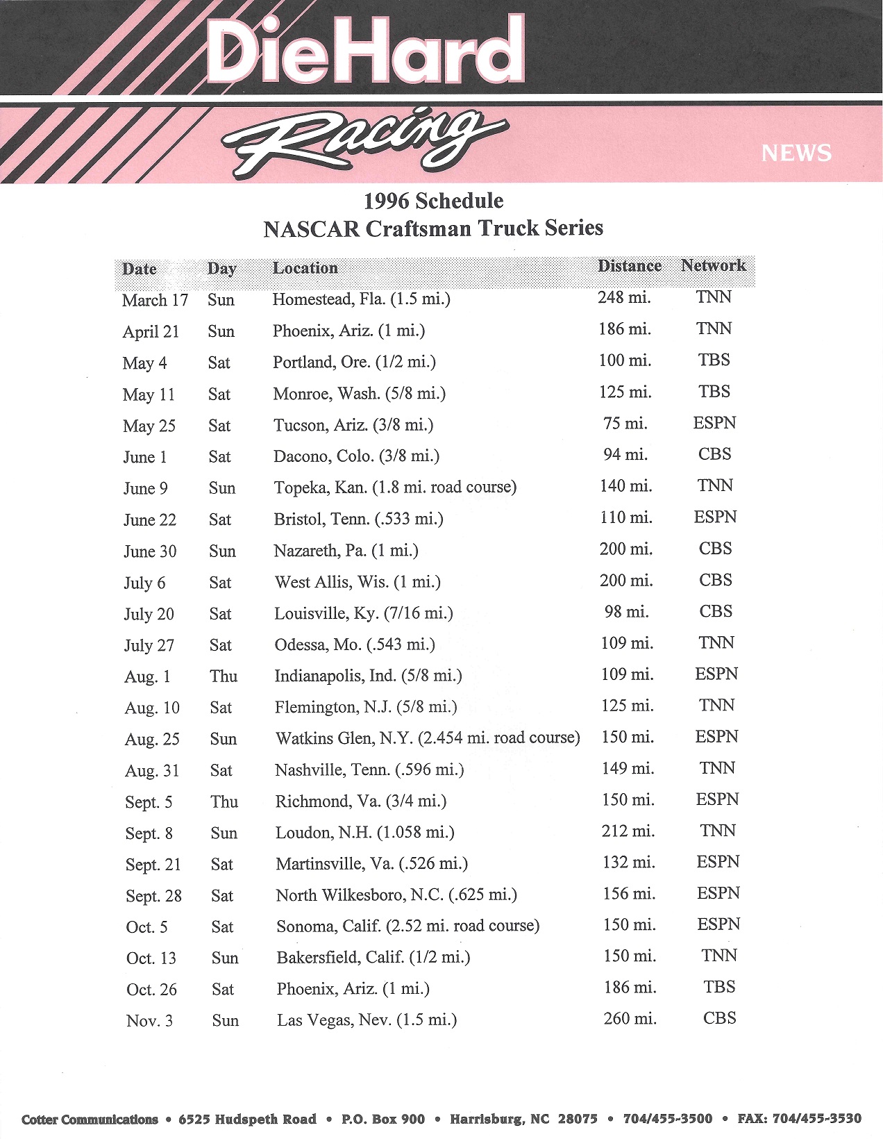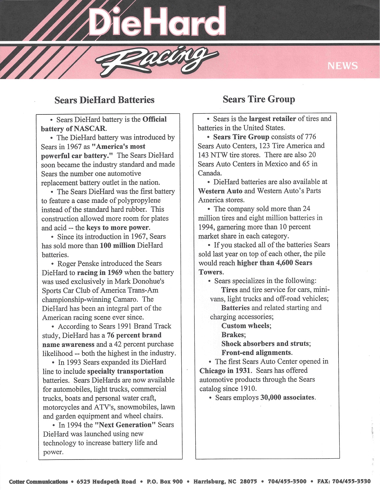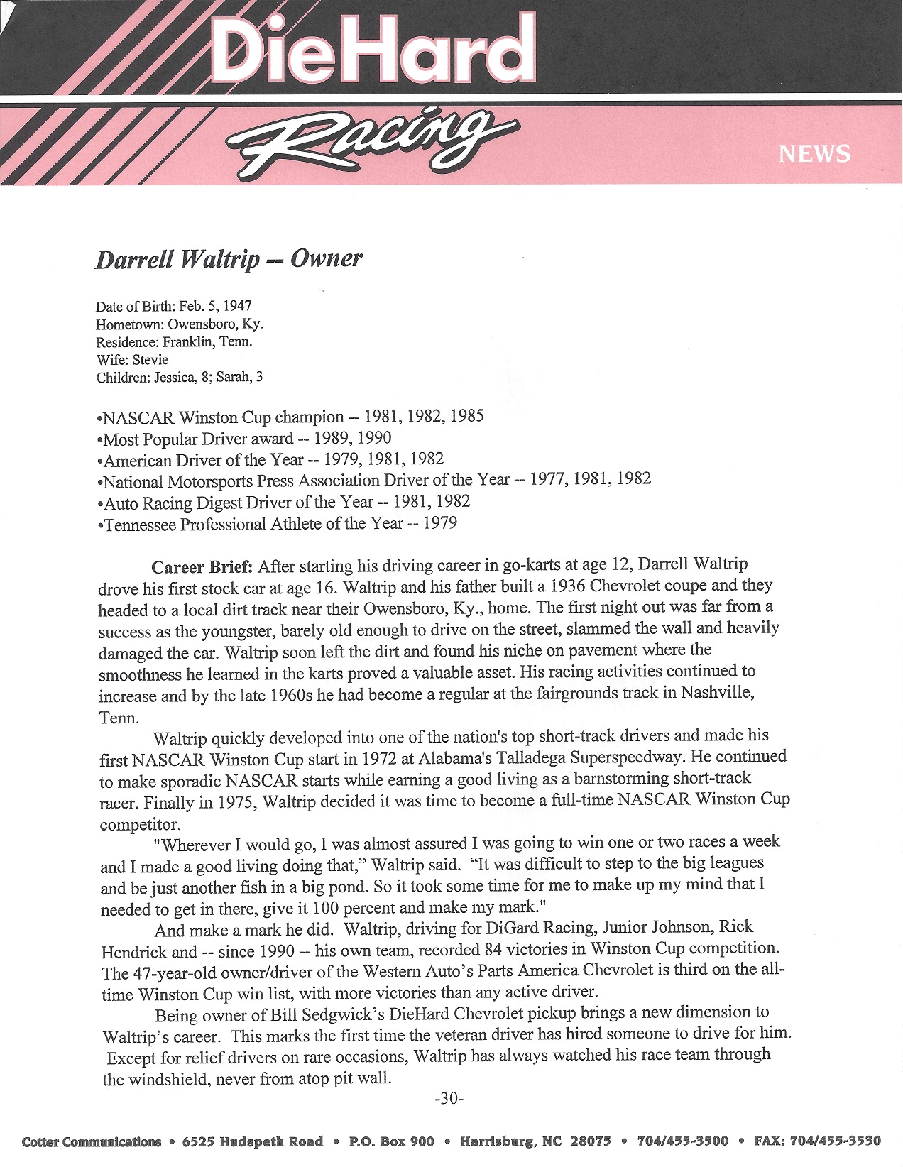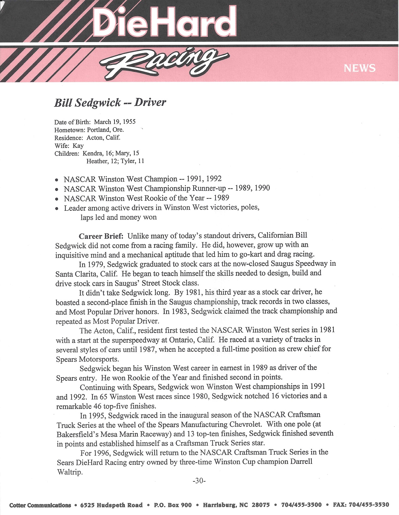 This is an example of a NASCAR press kit, this one from 1996. Bill Sedgwick was the driver of the #17 Die Hard Chevy C-1500. The team was owned by Darrell Waltrip, who also raced for the team in a number of events. In 1996, he started 23 of the 24 races in the Craftsman Truck Series, and had a decent season, with 3 top 5’s and 8 top 10’s, including a 2nd place finish at Milwaukee. He finished the season in 14th place. During the season, this press kit was distributed to the media. It comes in a custom folder,