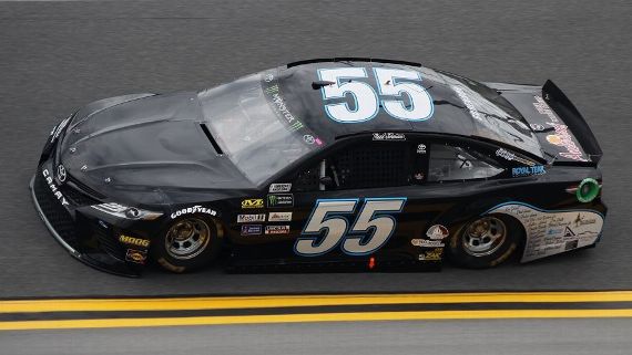 Michael Waltrip #15 Aaron’s Toyota Camry-New scheme for 2017, blue photo motif across car, white hood, yellow door numbers. D-